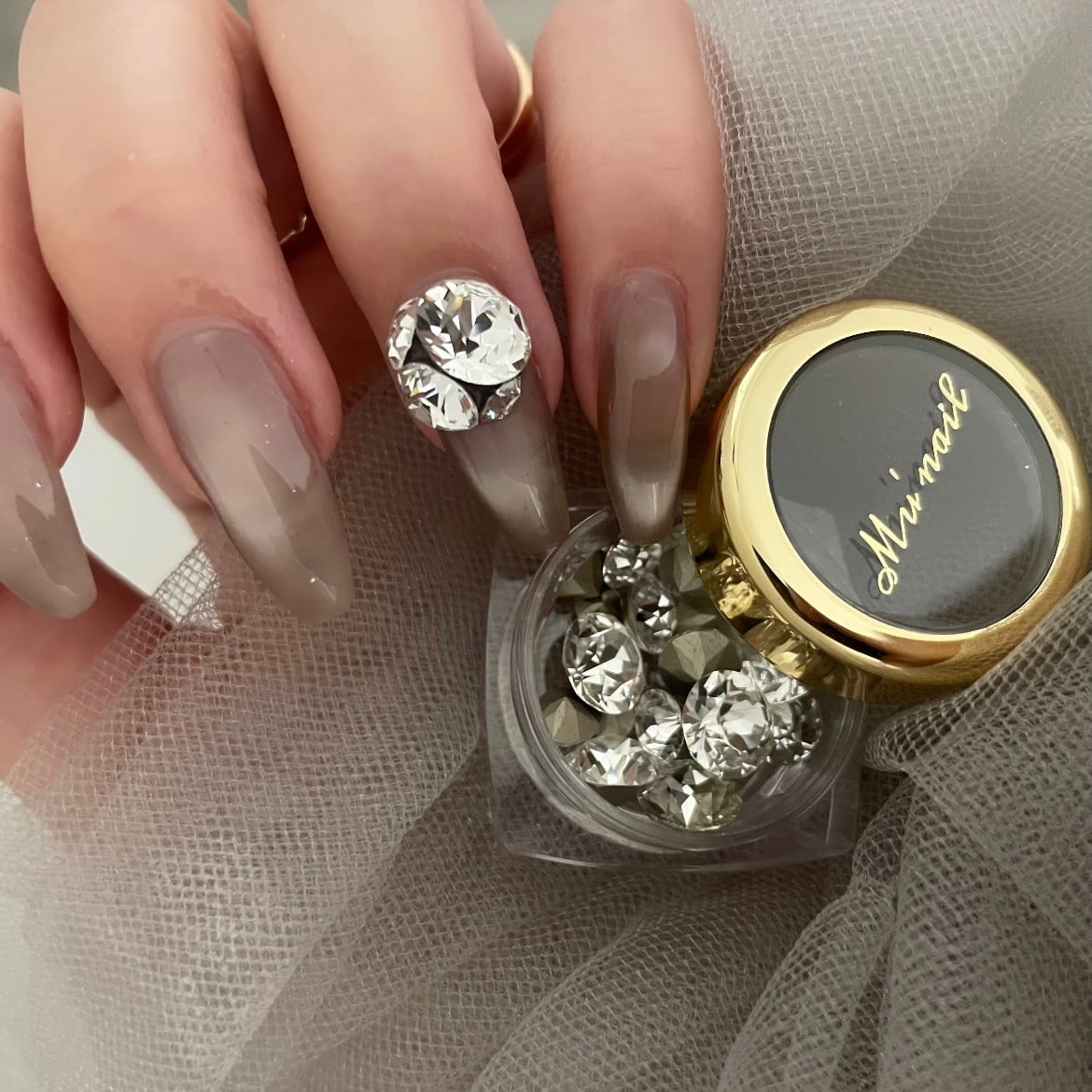 アクリルや&iiiのパーツジェルを使えばしっかり固定でき、トップジェルをかけずとも1ヶ月間、クリアな輝きが持続。